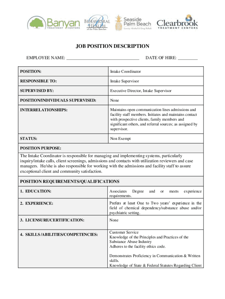 JOB POSITION DESCRIPTION EMPLOYEE NAME: ___DATE OF HIRE: ___POSITION:Intake CoordinatorRESPONSIBLE TO:Intake SupervisorSUPERVISED BY:Executive Director, Intake SupervisorPOSITION/INDIVIDUALS SUPERVISED:NoneINTERRELATIONSHIPS:Maintains