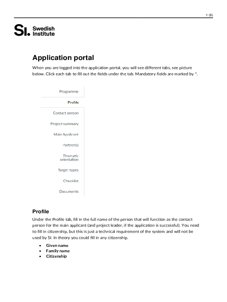 1 (6)Application portal When you are logged into the application portal, you will see different tabs, see picture below. Click each tab to fill out the fields under the tab. Mandatory fields are marked
