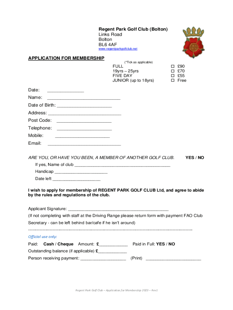 Regent Park Golf Club (Bolton) Links Road Bolton BL6 4AF www.regentparkgolfclub.netAPPLICATION FOR MEMBERSHIP (*Tick as applicable)FULL 19yrs 25yrs FIVE DAY JUNIOR (up to 18yrs)Date:___Name:___90