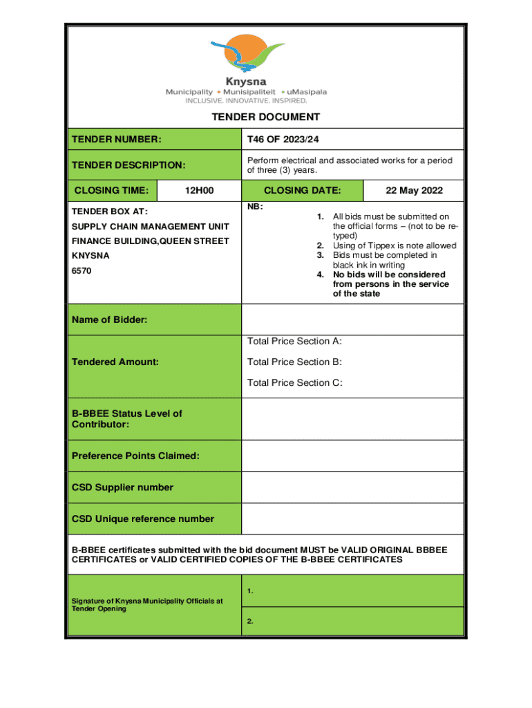 TENDER DOCUMENT TENDER NUMBER:T46 OF 2023/24TENDER DESCRIPTION:Perform electrical and associated works for a period of three (3) years. CLOSING TIME:12H00TENDER BOX AT:CLOSING DATE:22 May 2022NB: