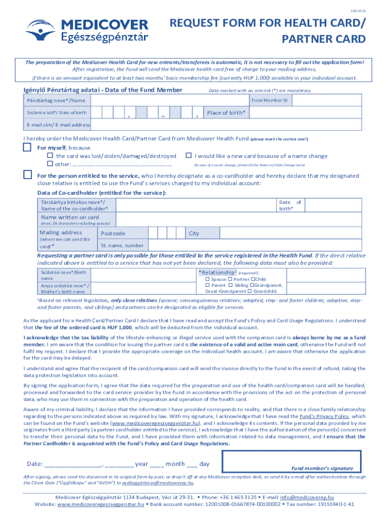 2022.02.01REQUEST FORM FOR HEALTH CARD/ PARTNER CARD The preparation of the Medic over Health Card for new entrants/transferees is automatic, it is not necessary to fill out the application form!