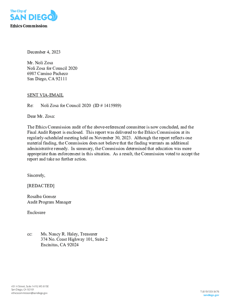 Ethics Commission December 4, 2023 Mr. Noli Zosa for Council 2020 6987 Camino Pacheco San Diego, CA 92111 SENT VOICEMAIL Re:Nola Rosa for Council 2020 (ID # 1415989)Dear Mr. Rosa: The Ethics Commission