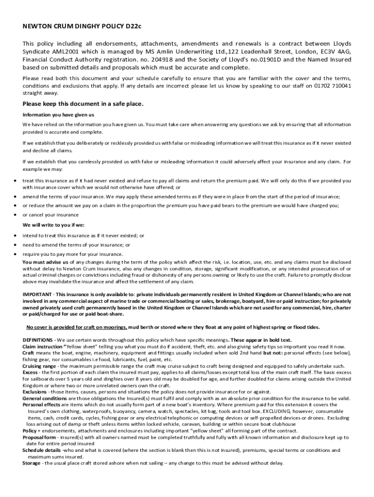 NEWTON DRUM DINGHY POLICY D22c This policy including all endorsements, attachments, amendments and renewals is a contract between Lloyd's Syndicate AML2001 which is managed by MS Hamlin Underwriting