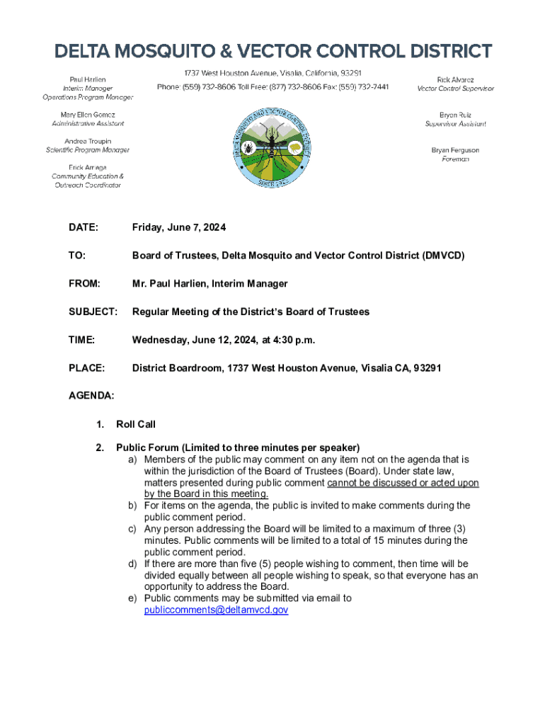 [Type here]DATE:Friday, June 7, 2024TO:Board of Trustees, Delta Mosquito and Vector Control District (DMV CD)FROM:Mr. Paul Earlier, Interim ManagerSUBJECT:Regular Meeting of the Districts Board of
