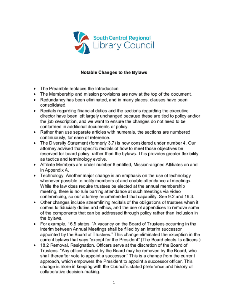 Notable Changes to the Bylaws The Preamble replaces the Introduction. The Membership and mission provisions are now at the top of the document. Redundancy has been eliminated, and in many places,