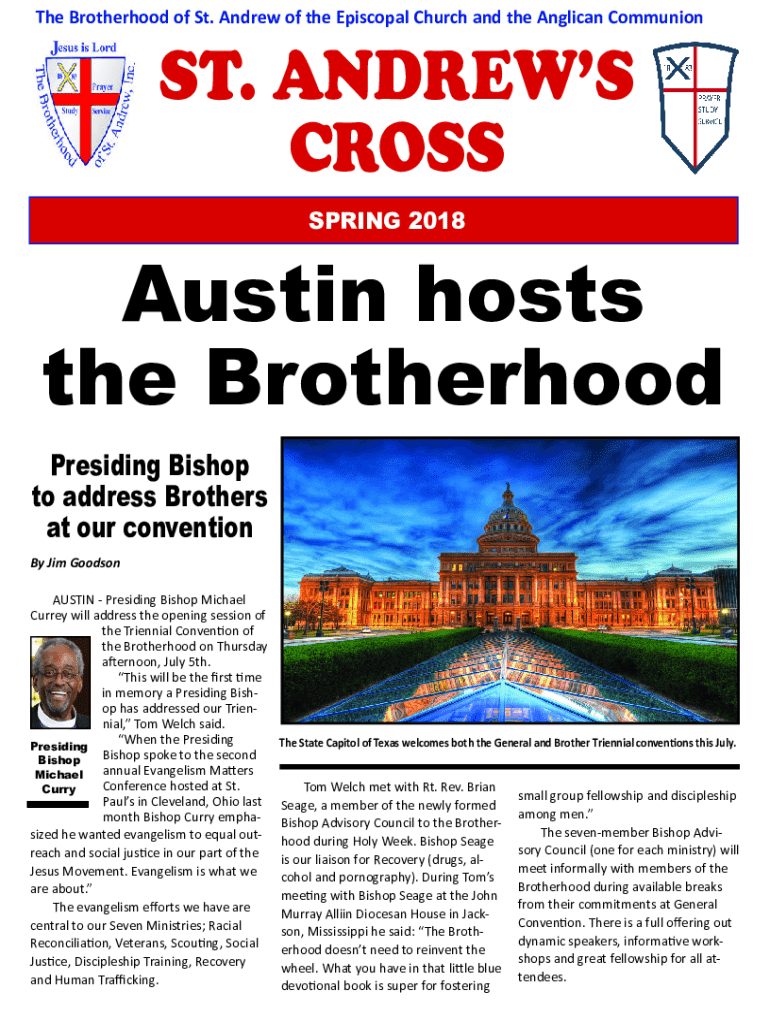 The Brotherhood of St. Andrew of the Episcopal Church and the Anglican Communions. ANDREWS CROSS SPRING 2018Austin hosts the Brotherhood Presiding Bishop to address Brothers at our convention By Jim