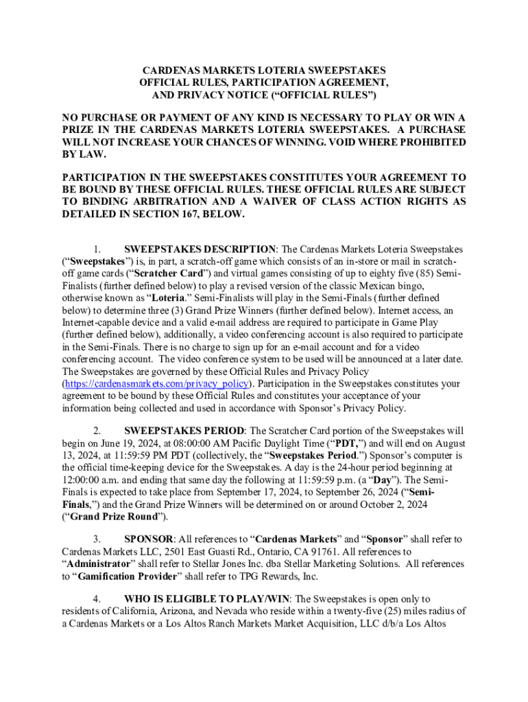 CARDENAS MARKETS LIBERIA SWEEPSTAKES OFFICIAL RULES, PARTICIPATION AGREEMENT, AND PRIVACY NOTICE (OFFICIAL RULES) NO PURCHASE OR PAYMENT OF ANY KIND IS NECESSARY TO PLAY OR WIN A PRIZE IN THE CARDENAS