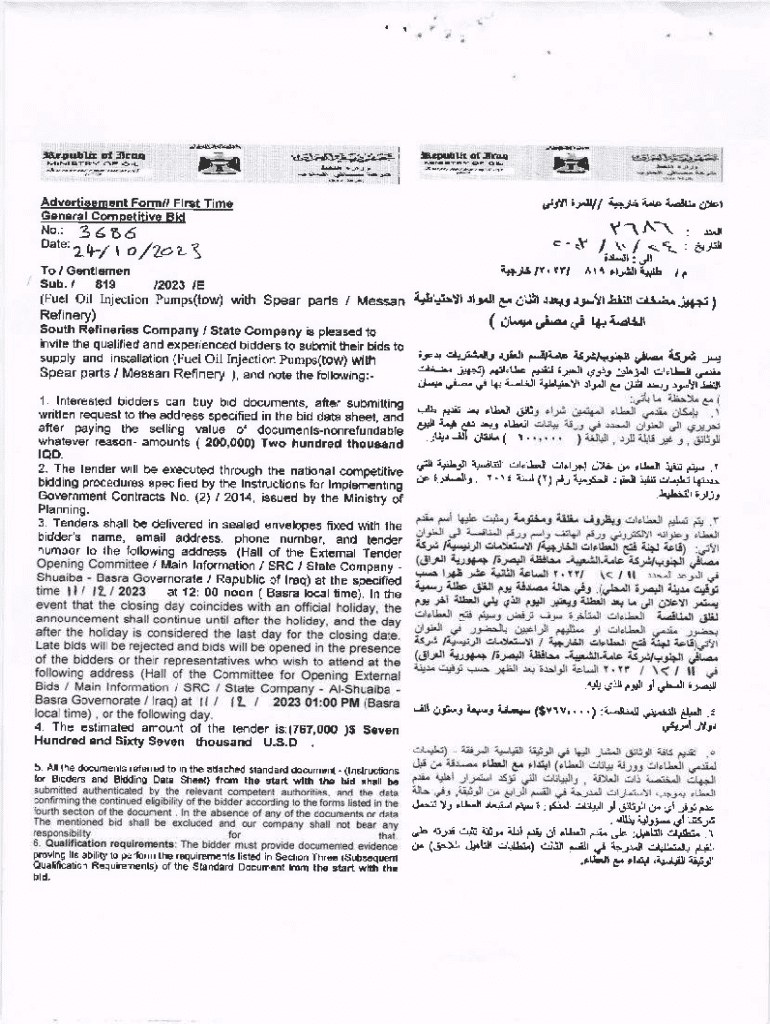 SRCQP23D083 Standard Bid Documents Supplying of Commodities1 Bid Documents To supply the commodities () / Fuel Oil Injection Pumps (tow) with Spear
