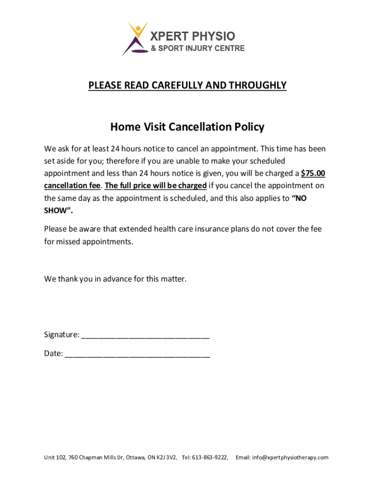 PLEASE READ CAREFULLY AND THROUGHLYHome Visit Cancellation Policy We ask for at least 24 hours notice to cancel an appointment. This time has been set aside for you; therefore if you are unable to