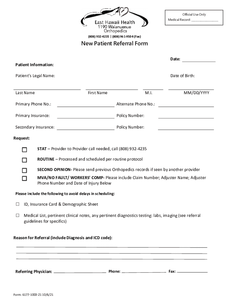 Official Use Only Medical Record: ___(808) 9324235 | (808) 9619504 (Fax)New Patient Referral Form Date:Patient Information: Patients Legal Name: Last NameDate of Birth: First NameM.I.Primary Phone
