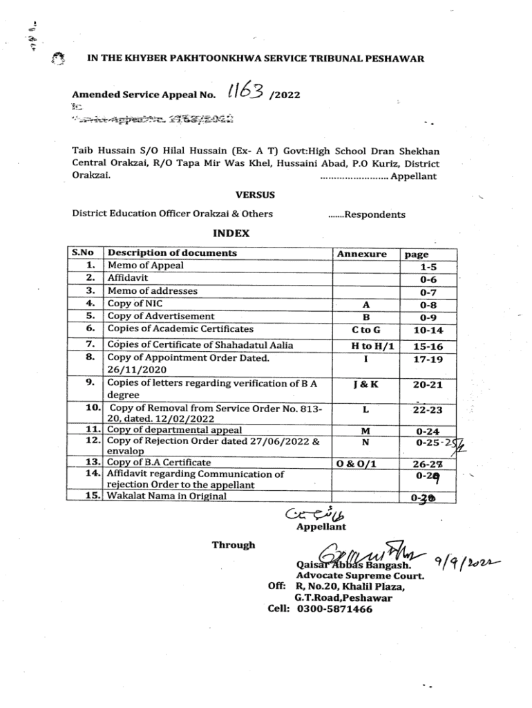 ITIN THE KHYBER PAKHTOONKHWA SERVICE TRIBUNAL PESHAWARAmended Service Appeal No. (1^3 /2022fc. Taib Hussain S/0 Hill Hussain (Ex A T) Govt:High School Ran She khan