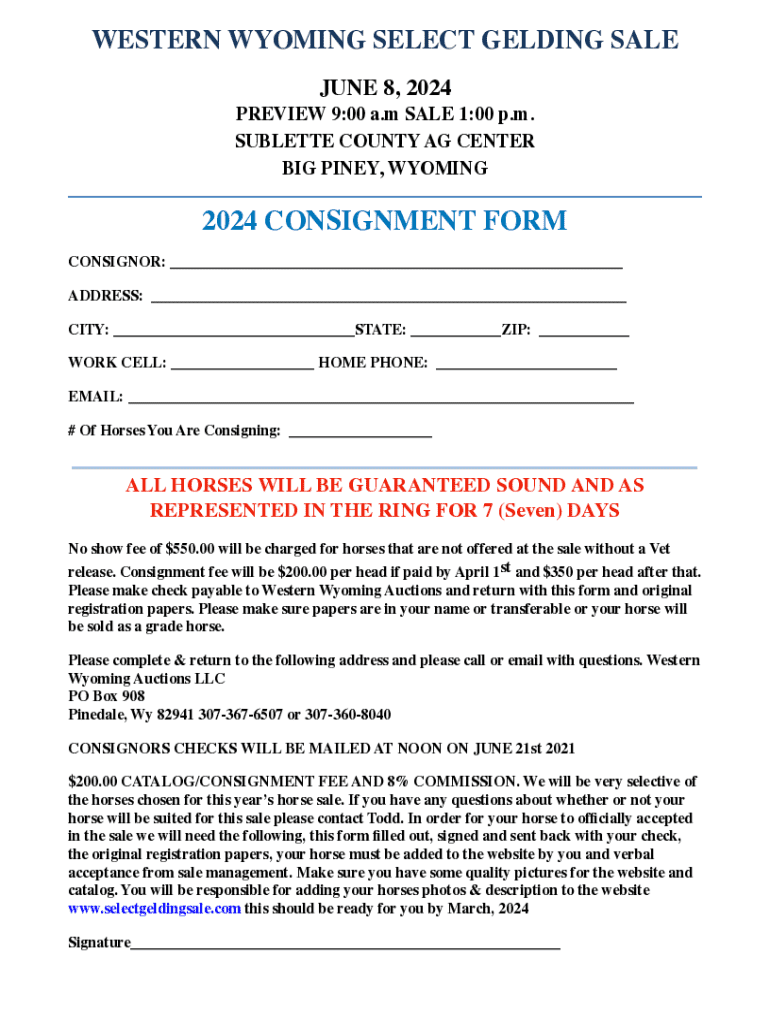 WESTERN WYOMING SELECT GELDING SALE JUNE 8, 2024 PREVIEW 9:00 a.m SALE 1:00 p.m. SUBLETTE COUNTY AG CENTER BIG PINEY, WYOMING2024 CONSIGNMENT FORM CONSIGNOR: ___ ADDRESS: ___ CITY: ___STATE: ___ZIP: