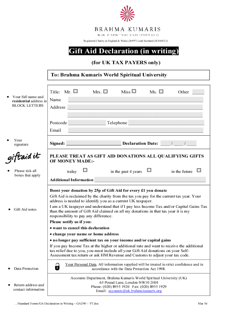 Registered Charity in England & Wales (269971) and Scotland (SC040512)Gift Aid Declaration (in writing) (for UK TAX PAYERS only) To: Brahma Kumaris World Spiritual University Title: Mr. Your full