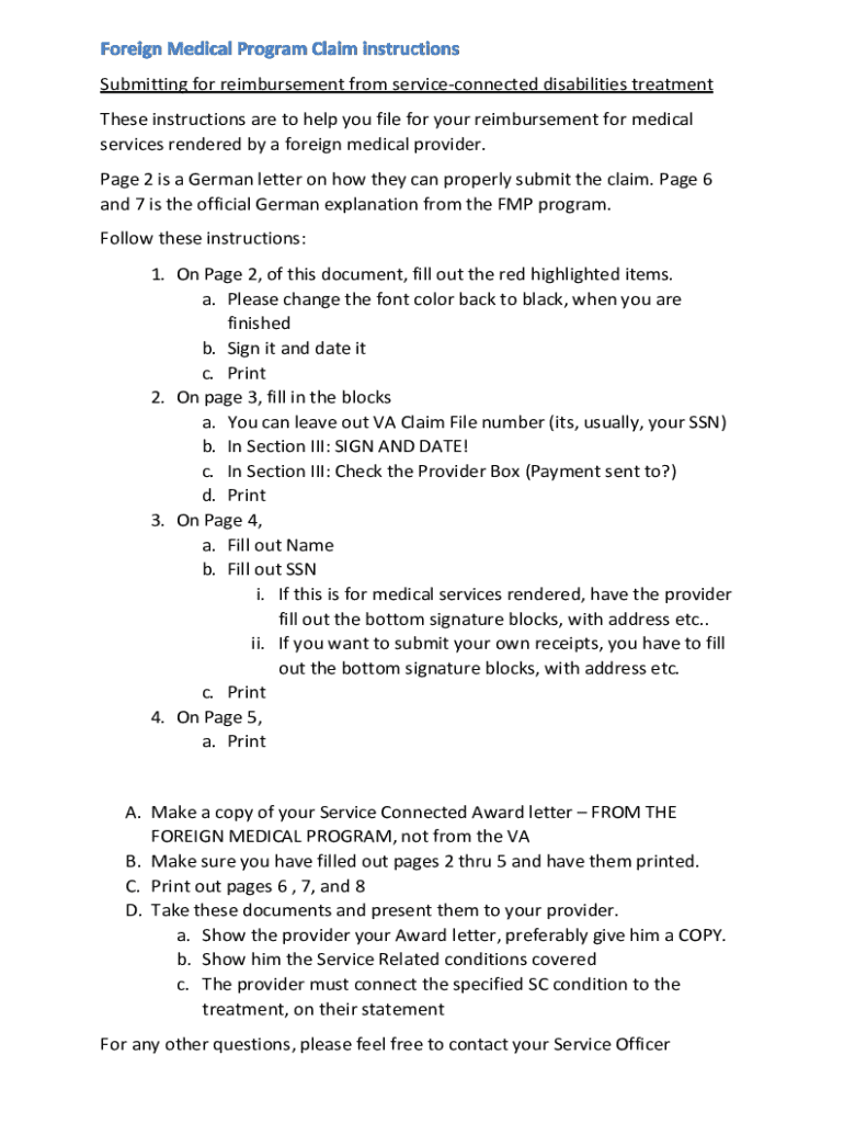 Submitting for reimbursement from serviceconnected disabilities treatment These instructions are to help you file for your reimbursement for medical services rendered by a foreign medical provider.