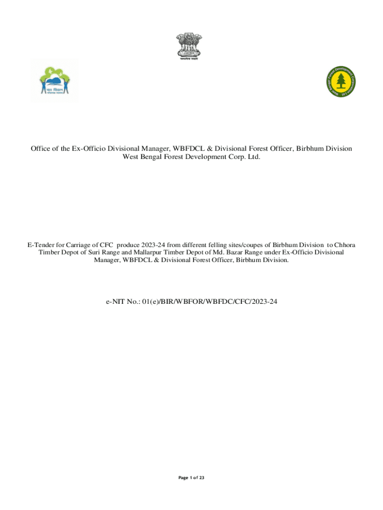 Office of the ExOfficio Divisional Manager, WBFDCL & Divisional Forest Officer, Birbhum Division West Bengal Forest Development Corp. Ltd.ETender for Carriage of CFC produce 202324 from different