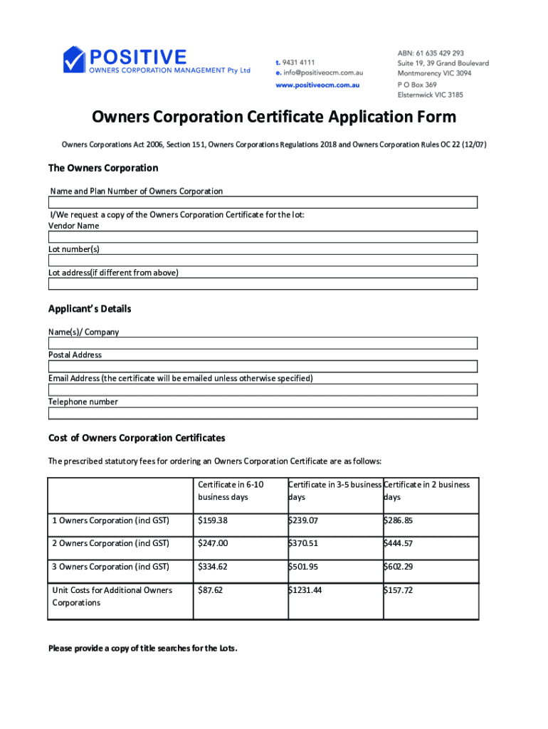 Owners Corporation Certificate Application Form Owners Corporations Act 2006, Section 151, Owners Corporations Regulations 2018 and Owners Corporation Rules OC 22 (12/07)The Owners Corporation Name