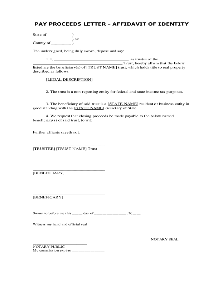 PAY PROCEEDS LETTER AFFIDAVIT OF IDENTITY State of ___ ) ) ss: County of ___ ) The undersigned, being duly sworn, depose and say: 1. I, ___, as trustee of the ___ Trust, hereby affirm that the below