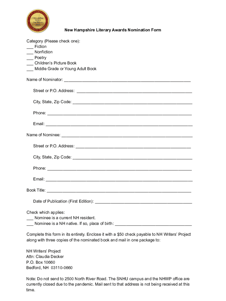 New Hampshire Literary Awards Nomination Form Category (Please check one): ___ Fiction ___ Nonfiction ___ Poetry ___ Childrens Picture Book ___ Middle Grade or Young Adult Book Name of Nominator: