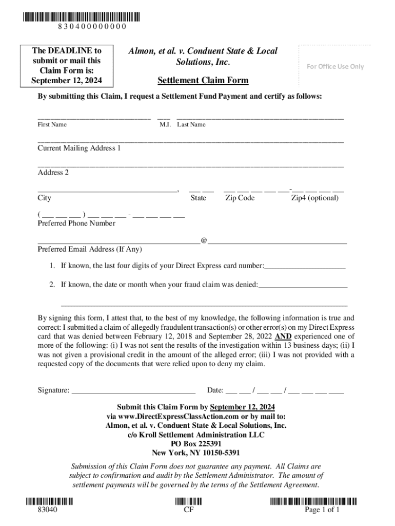 *830400000000* 830400000000The DEADLINE to submit or mail this Claim Form is: September 12, 2024Almon, et al. v. Conduct State & Local Solutions, Inc. For Office Use OnlySettlement Claim Form submitting