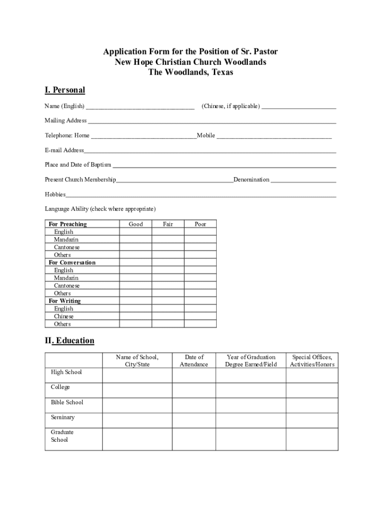 This document is an application form for the position of Senior Pastor at New Hope Christian Church in Woodlands, Texas. It includes sections for personal information, education, ministerial experience, references, biographical facts concerning Christian life and service, self-identification details, resume, and spouse\'s biographical information.