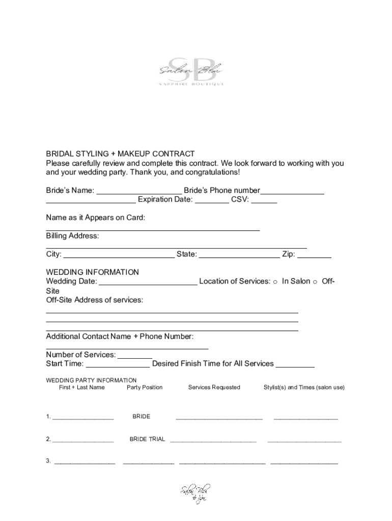 BRIDAL STYLING + MAKEUP CONTRACT Please carefully review and complete this contract. We look forward to working with you and your wedding party. Thank you, and congratulations! Brides Name: ___ Brides