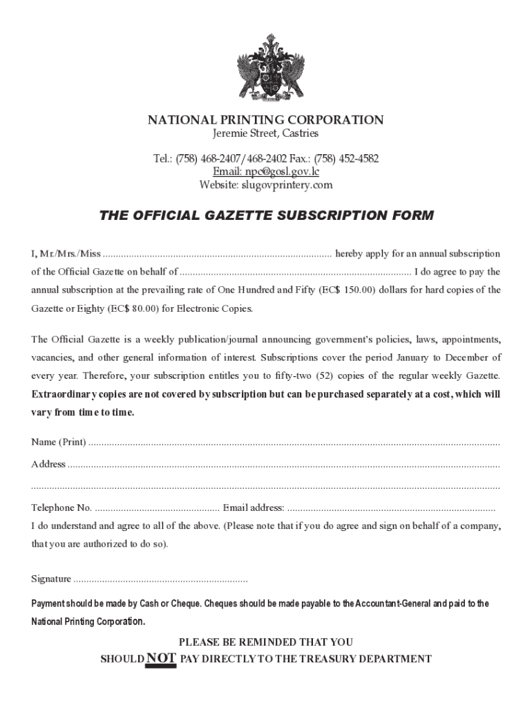 NATIONAL PRINTING CORPORATION Jeremie Street, CastriesTel.: (758) 4682407/4682402 Fax.: (758) 4524582 Email: npc@gosl.gov.lc Website: slugovprintery.comThe Official Gazette Subscription Form I, Mr./Mrs./Miss