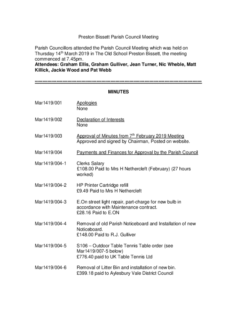 Preston Bissett Parish Council Meeting Parish Councillors attended the Parish Council Meeting which was held on Thursday 14th March 2019 in The Old School Preston Bissett, the meeting commenced at