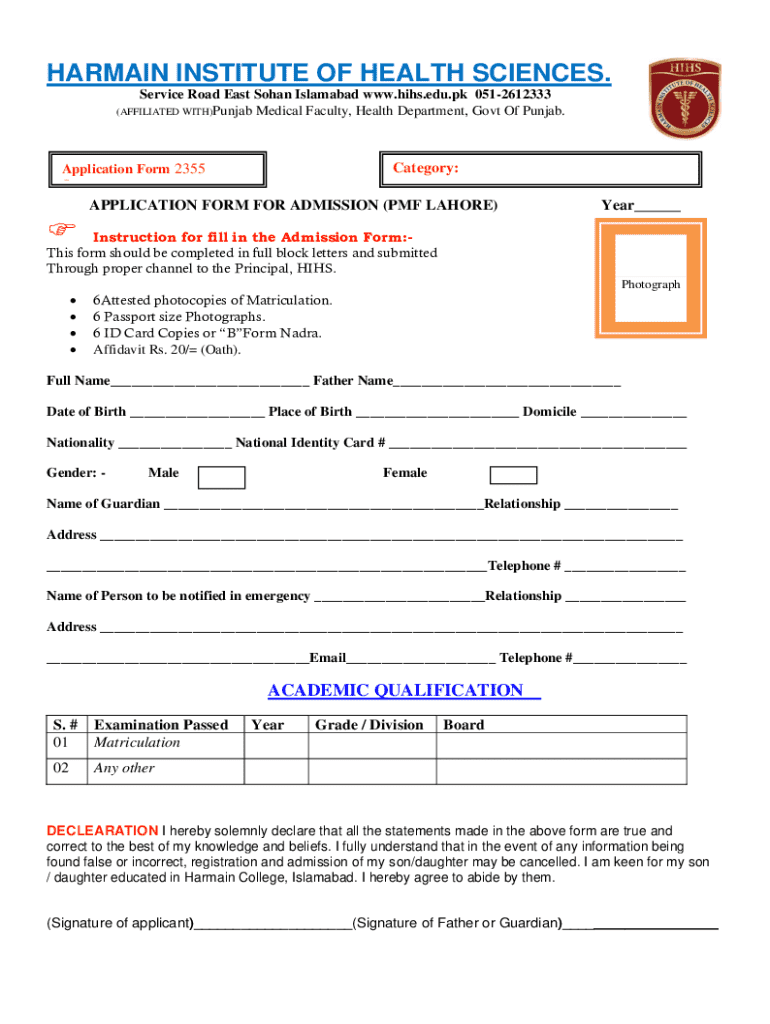 HERMAN INSTITUTE OF HEALTH SCIENCES. Service Road East Shan Islamabad www.hihs.edu.pk 0512612333 Medical Faculty, Health Department, Govt Of Punjab.(AFFILIATED WITH)PunjabCategory:Application Form