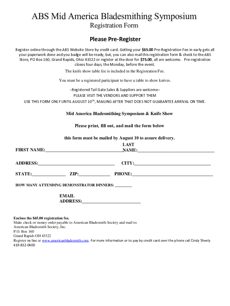 ABS Mid-America Blacksmithing Symposium Registration Form Please Preregister Register online through the ABS Website Store by credit card. Getting your $65.00 Preregistration Fee in early gets all