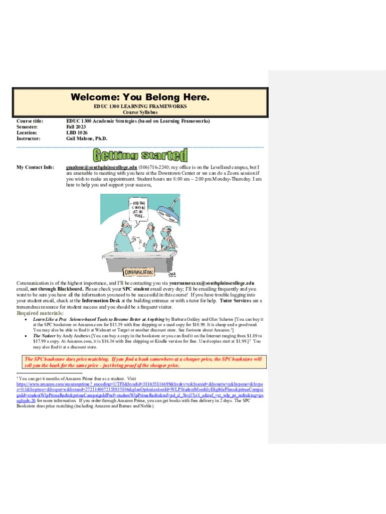 Welcome: You Belong Here. EDUC 1300 LEARNING FRAMEWORKS Course SyllabusCourse title: EDUC 1300 Academic Strategies (based on Learning Frameworks) Semester: Fall 2023 Location: LBD 1026 Instructor: