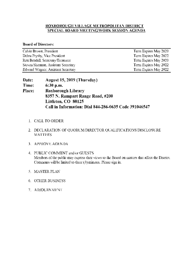 FOXBOROUGH VILLAGE METROPOLITAN DISTRICT SPECIAL BOARD MEETING/WORK SESSION AGENDABoard of Directors: Calvin Brown, President Debra Crosby, Vice President Ron Kendall, Secretary/Treasurer Steven Sherman,