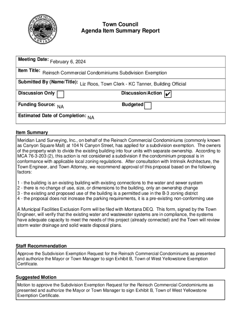 Town of West Yellowstone Tuesday, February 6, 2024, West Yellowstone Town Hall, 440 Yellowstone Avenue The Town Council work session/meeting will be conducted in person and virtually using ZOOM, connect