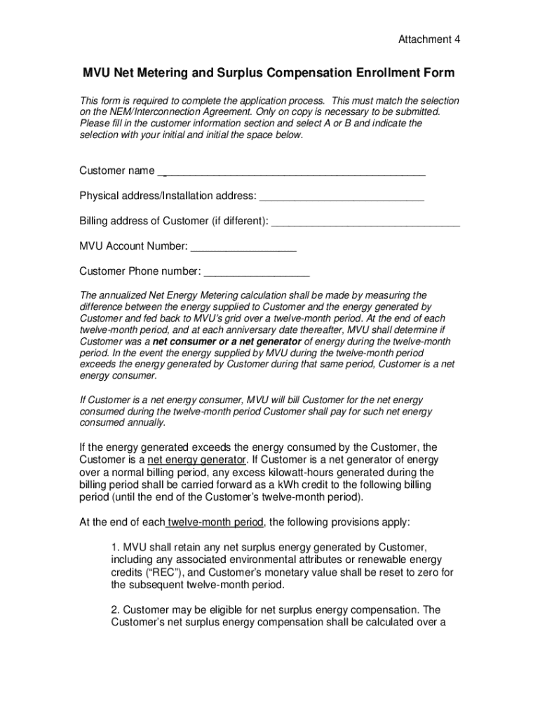 Attachment 4MVU Net Metering and Surplus Compensation Enrollment Form This form is required to complete the application process. This must match the selection on the NEM/Interconnection Agreement.