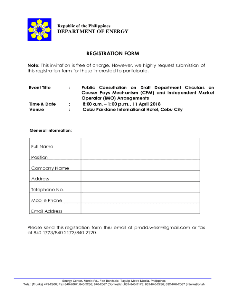 Republic of the PhilippinesDEPARTMENT OF ENERGYREGISTRATION FORM Note: This invitation is free of charge. However, we highly request submission of this registration form for those interested to participate.