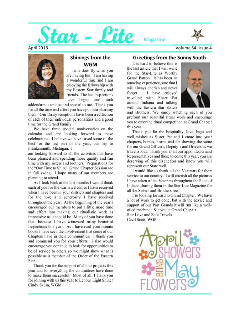 Star LiteApril 2018Shinings from the WGM Time does fly when you are having fun! I am having a wonderful time and I am enjoying the fellowship with my Eastern Star family and friends. The last Inspections