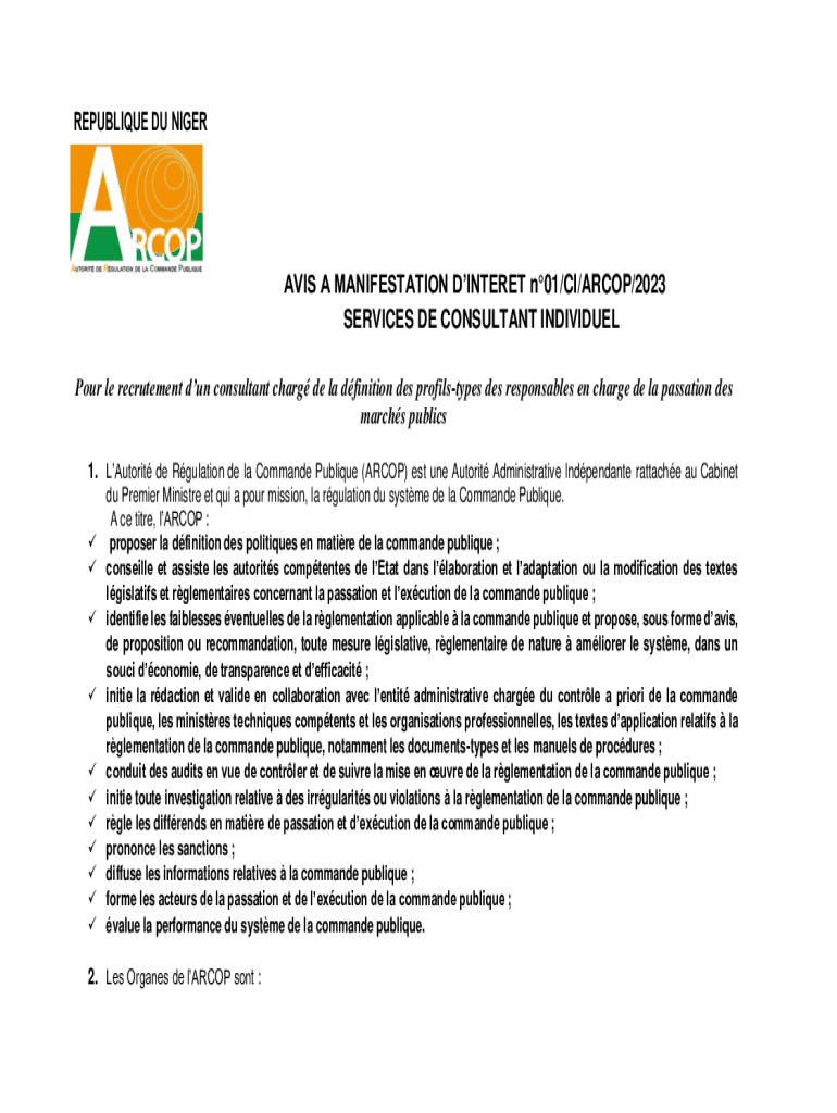 REPUBLICAN DU NIGERIA A MANIFESTATION INTEREST n01/CI/ARCEP/2023