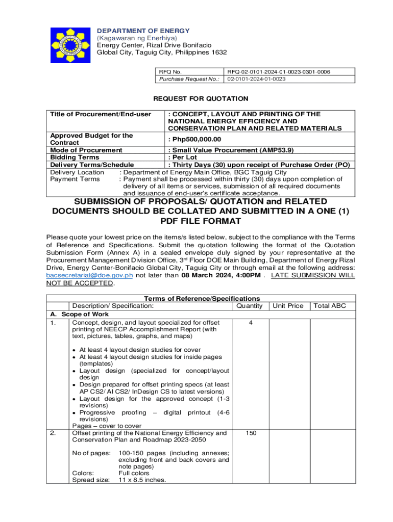 DEPARTMENT OF ENERGY (Kagawaran ng Enerhiya) Energy Center, Rizal Drive Bonifacio Global City, Taguig City, Philippines 1632 RFQ No. Purchase Request No.:RFQ020101202401002303010006 0201012024010023REQUEST