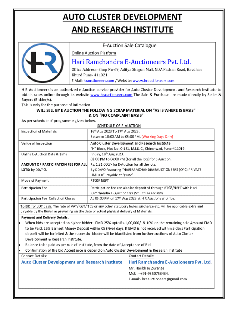 AUTO CLUSTER DEVELOPMENT AND RESEARCH INSTITUTE EAuction Sale Catalogue Online Auction PlatformHari Ramchandra EAuctioneers Pvt. Ltd. Office Address:Shop No69, Aditya Shagun Mall, NDA Pashan Road,