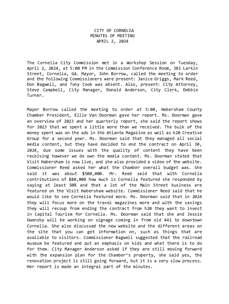 CITY OF CORNELIA MINUTES OF MEETING APRIL 2, 2024The Cornelia City Commission met in a Workshop Session on Tuesday, April 2, 2024, at 5:00 PM in the Commission Conference Room, 181 Larking Street,
