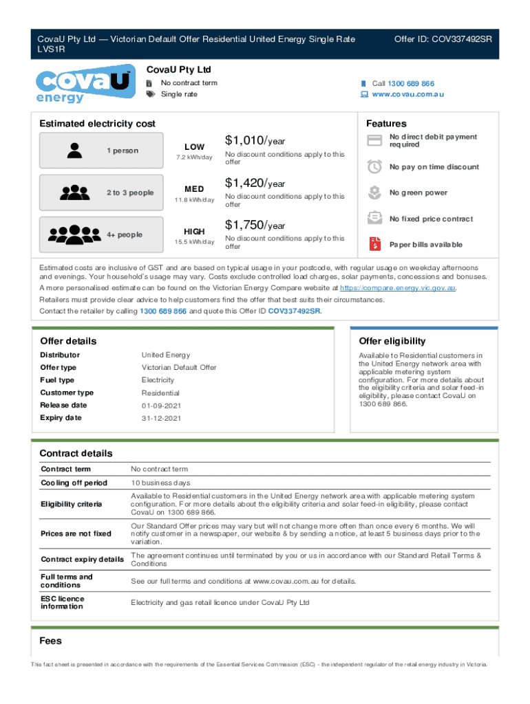 Covey Pty Ltd Victorian Default Offer Residential United Energy Single Rate LVS1ROffer ID: COV337492SRCovaU Pty Ltd No contract term Single rateEstimated electricity misfeatures LOW1 person7.2 kWh/day2
