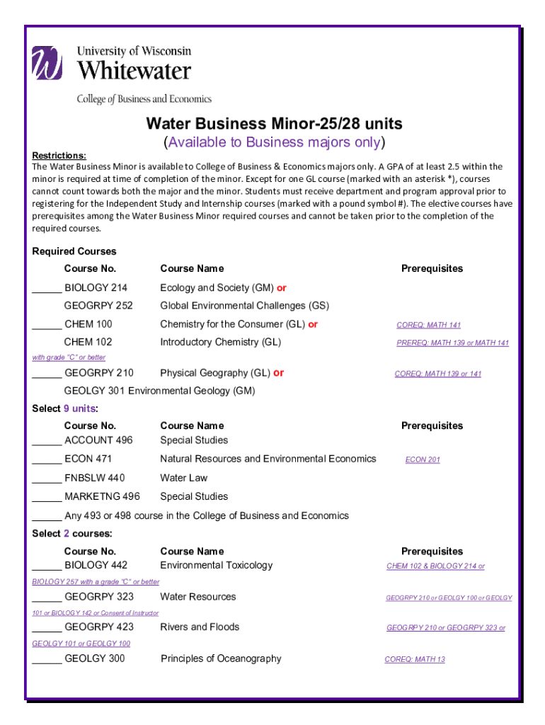 Water Business Minor25/28 units Restrictions:(Available to Business majors only)The Water Business Minor is available to College of Business & Economics majors only. A GPA of at least 2.5 within the