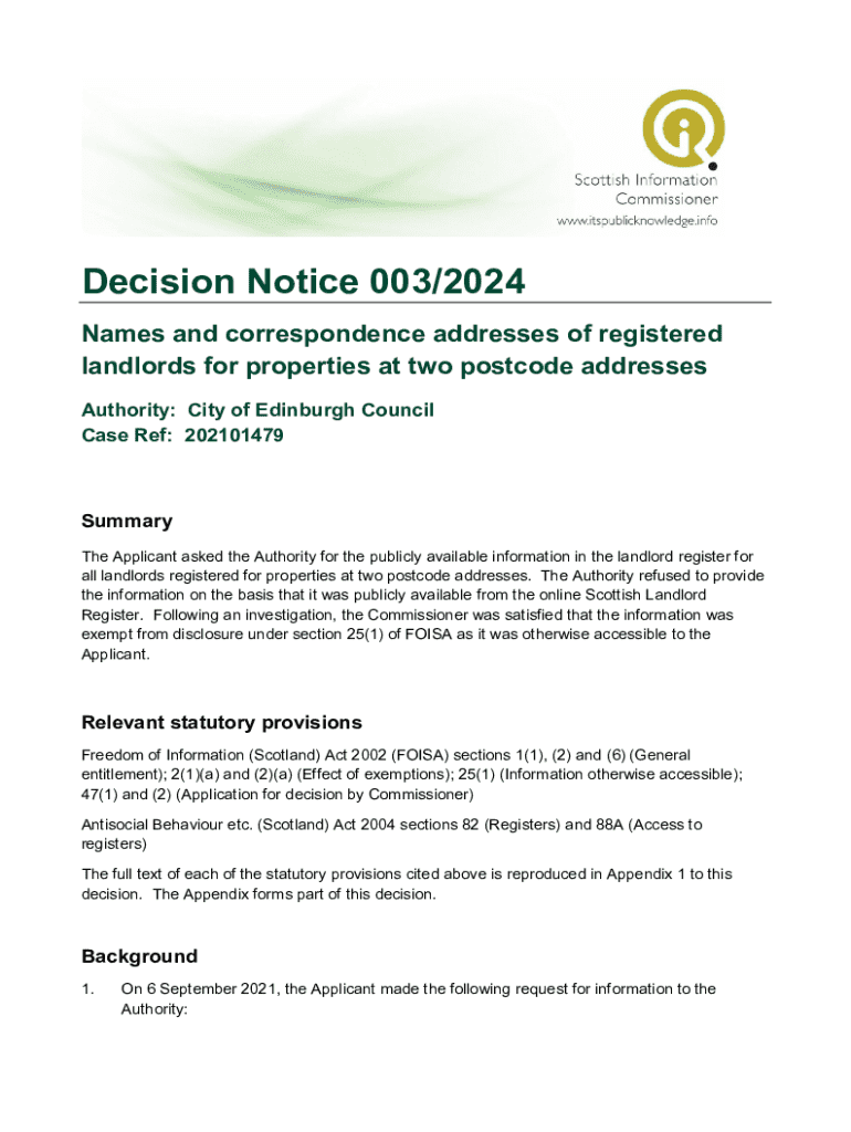 Decision Notice 003/2024 Names and correspondence addresses of registered landlords for properties at two postcode addresses Authority: City of Edinburgh Council Case Ref: 202101479Summary The Applicant