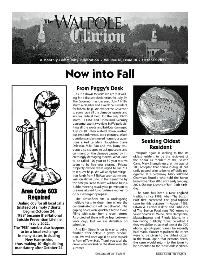 A Monthly Community Publication Volume XI, Issue 10 October, 2021Now into Fall From Peggy's Declared Code 603 RequiredDialing 603 for all local calls (instead of simply 7 digits) begins October 24.