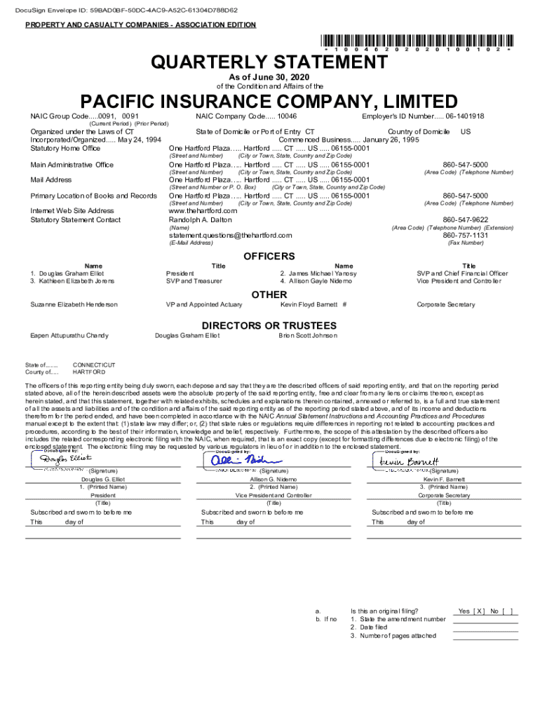 DocuSign Envelope ID: 59BAD0BF50DC4AC9A52C61304D788D62PROPERTY AND CASUALTY COMPANIES ASSOCIATION EDITION*10046202020100102*QUARTERLY STATEMENT As of June 30, 2020 of the Condition and Affairs of