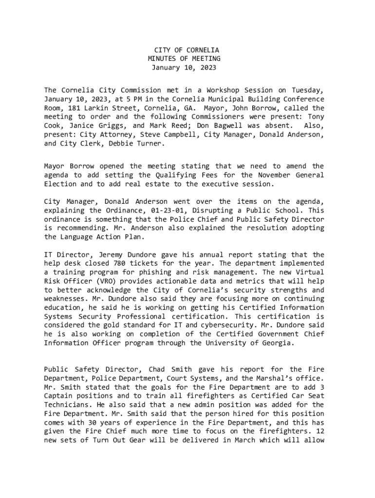 CITY OF CORNELIA MINUTES OF MEETING January 10, 2023, The Cornelia City Commission met in a Workshop Session on Tuesday, January 10, 2023, at 5 PM in the Cornelia Municipal Building Conference Room,