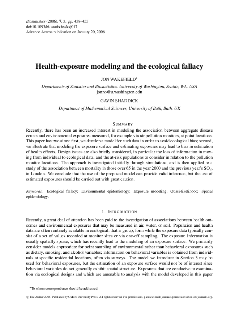 Biostatistics (2006), 7, 3, pp. 438455 doi:10.1093/biostatistics/kxj017 Advance Access publication on January 20, 2006Healthexposure modeling and the ecological fallacy JON WAKEFIELD Departments of