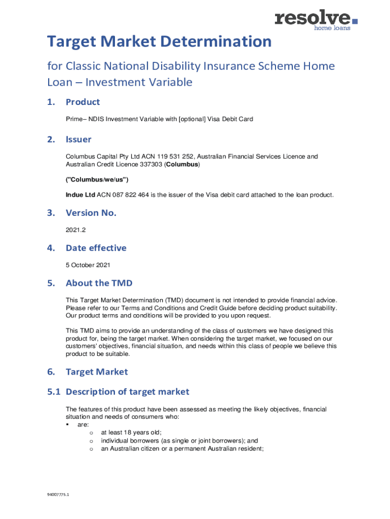 Target Market Determination for Classic National Disability Insurance Scheme Home Loan Investment Variable 1. Product Prime NDIS Investment Variable with [optional] Visa Debit Card2. Issuer Columbus