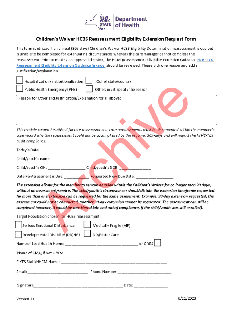 Get the free Children’s Waiver HCBS Reassessment Eligibility Extension Request Form Children’s Wa...