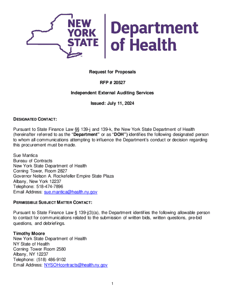 Request for Proposals RFP # 20527 Independent External Auditing Services Issued: July 11, 2024DESIGNATED CONTACT: Pursuant to State Finance Law 139j and 139k, the New York State Department of Health