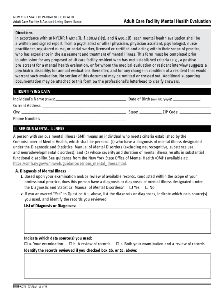 NEW YORK STATE DEPARTMENT OF HEALTH Adult Care Facility & Assisted Living SurveillanceAdult Care Facility Mental Health EvaluationDirections In accordance with 18 NYCRR 487.4(i), 488.4(e)(3), and